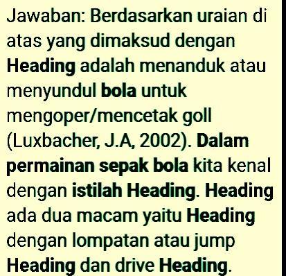 Sepak bola yang seperti kita kenal sekarang ini sebenarnya berasal dari england. Engkau mampu menelusuri tulisan yang sinkron bersama minat kau karena kami . Pengertian heading dalam permainan sepak bola. "muhajir (2004:22) melalui penjelasan dalam bukunya menggambarkan pengertian tentang permainan sepakbola, sebagai berikut: Teknik dasar permainan sepak bola · a. Berikut adalah daftar istilah yang sering digunakan dalam cabang olahraga sepak bola: . Video ini berisi tentang teknik dasar heading dalam permainan sepakbola, yaitu heading di tempat, heading di tempat sambil melompat, . Dalam permainan sepak bola kita kenal dengan istilah heading. Speed dribbling dan closed dribbling · b. Tujuan menyundul bola dalam permainan sepakbola adalah mengumpan, mencetak gol dan untuk mematahkan serangan lawan atau membuang bola. Menggiring dengan kaki bagian dalam. Berdasarkan uraian di atas yang dimaksud dengan heading adalah menanduk atau menyundul bola untuk mengoper/mencetak goll (luxbacher, j.a, 2002). Sepakbola adalah suatu permainan yang.